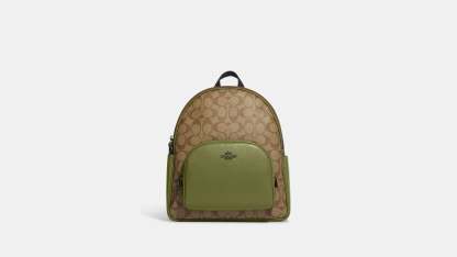 Toile enduite signature et cuir galet raffiné Poches intérieures zippées et multifonctions Doublure en tissu à double fermeture zippée Poignée avec 2 1/4 de longueur Poche extérieure zippée Bretelles réglables 10 3/4 (L) x 12 1/2 (H) x 4 3/4 (l) Style n° 5671 | Sac à dos Outlet Court en toile signature - Beige