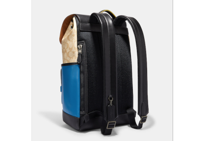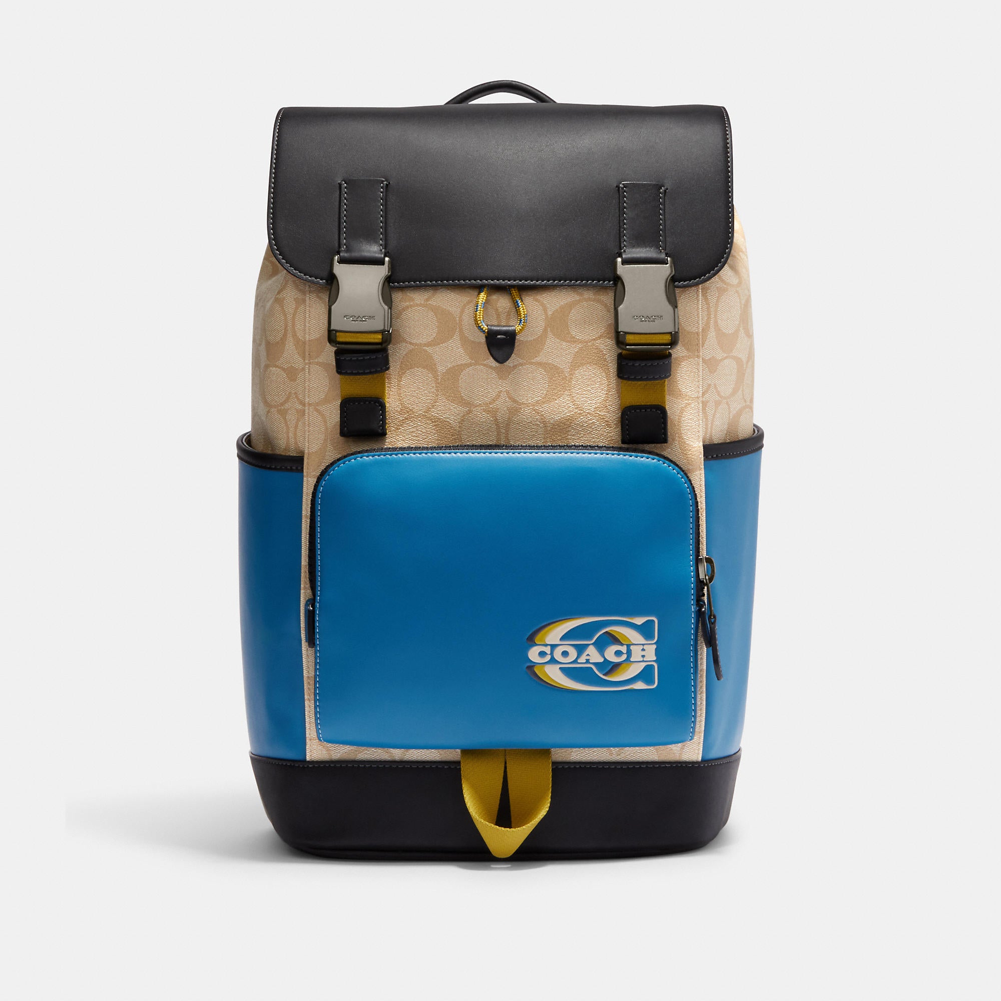 Toile enduite signature et cuir de veau lisse Poches intérieures zippées pour téléphone portable et multifonctions Pochette intérieure pour ordinateur Fermetures à cordon et à clip rapide Doublure en tissu Poignée supérieure avec 2 1/4 de longueur Poches extérieures zippées et plaquées Accès extérieur à l'intérieur par zip Bretelles réglables 10 1/2 (L) x 16 1/2 (H) x 6 (l) N° de modèle CH116 | Sac à dos Outlet Track en toile Signature Colorblock avec tampon - Multi