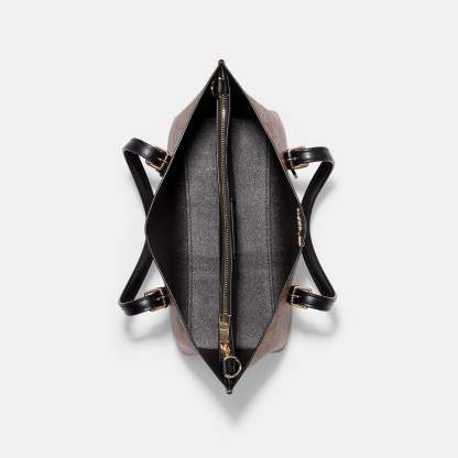 Toile enduite signature et cuir lisse Doublure en tissu avec fermeture éclair sur le dessus Compartiments latéraux ouverts Poignées de 4 3/4 pouces Bandoulière amovible de 22 pouces pour un port à l'épaule ou en bandoulière 9 3/4 (L) x 7 1/2 (H) x 4 3/4 (l) N° de style C4250