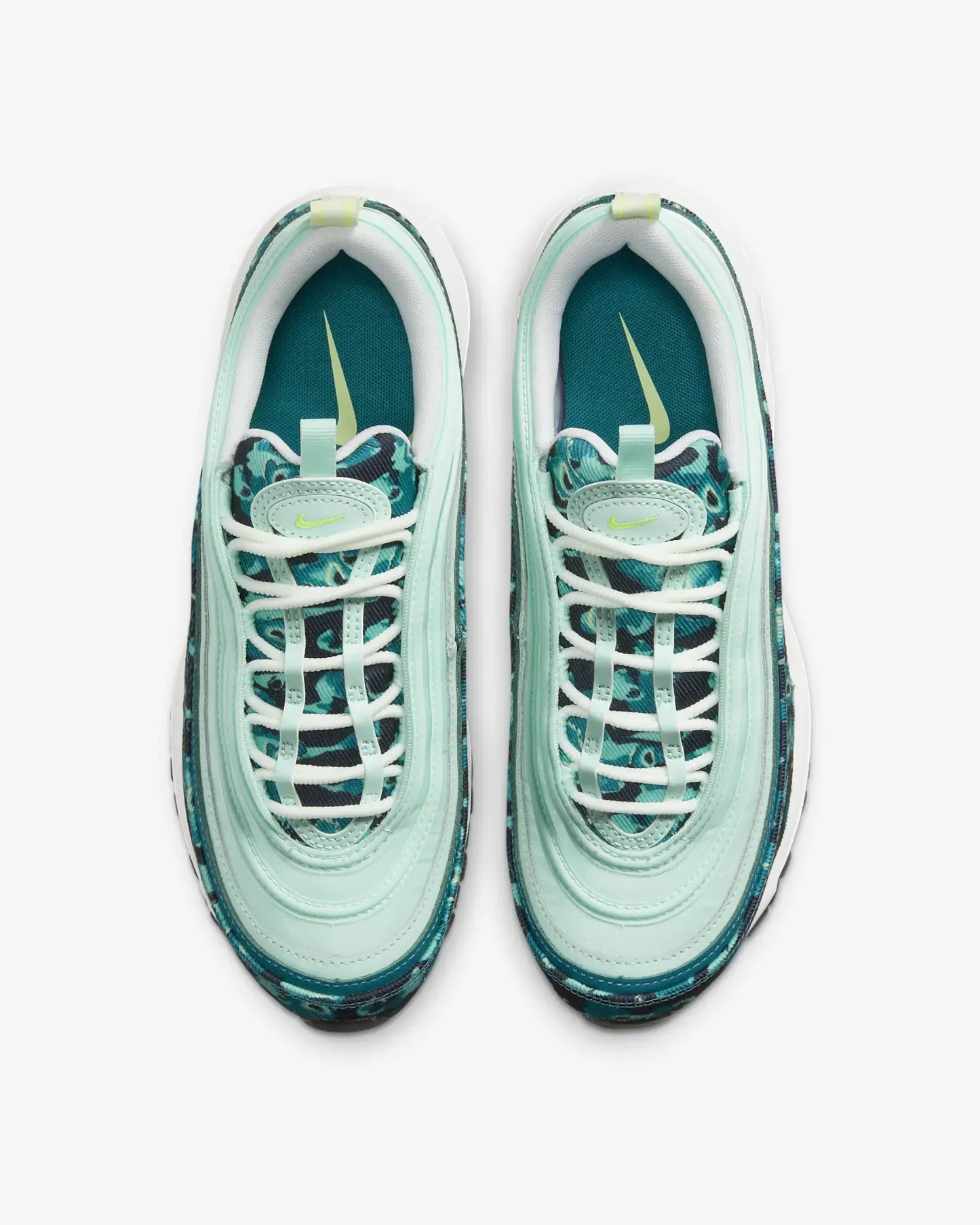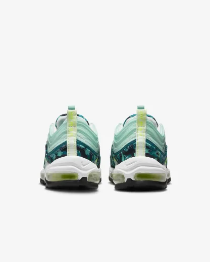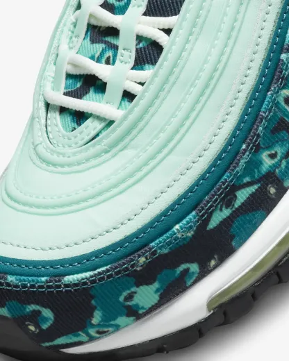 Innovation meets transformation in this Air Max 97. A design originally influenced by bullet trains gets revamped with a print inspired by the patterns moths use to camouflage themselves in nature. Shades of teal add fresh, calming energy while a full-length Air unit brings you first-class comfort.