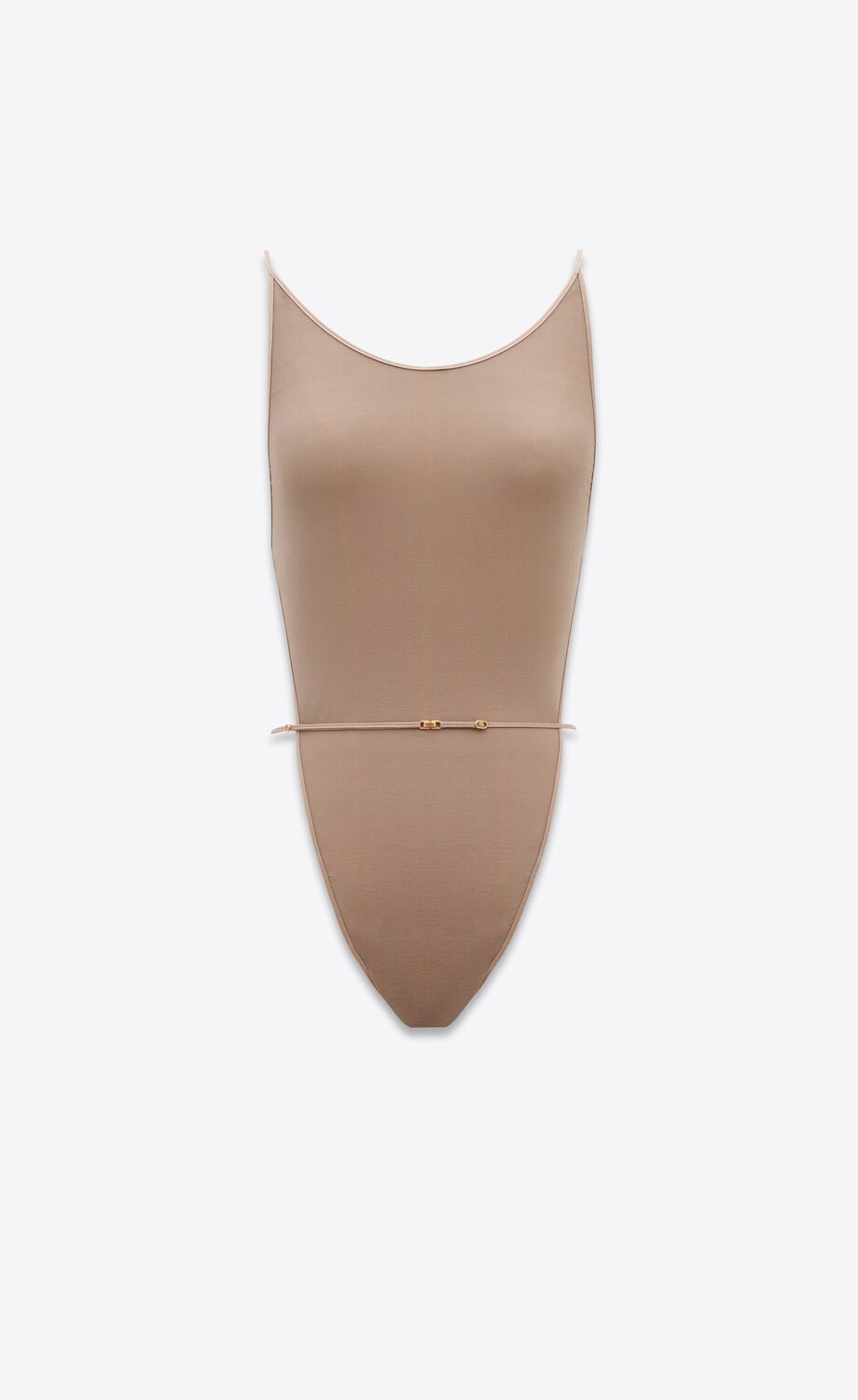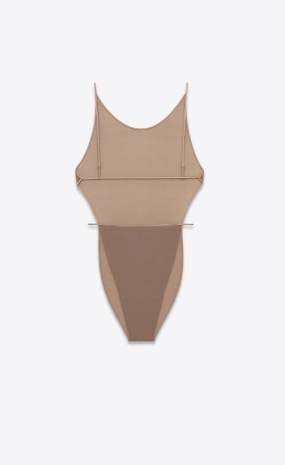 Body semi-transparent dos nu avec décolleté rond et string, avec une jambe échancrée, une taille réglable et un slip.