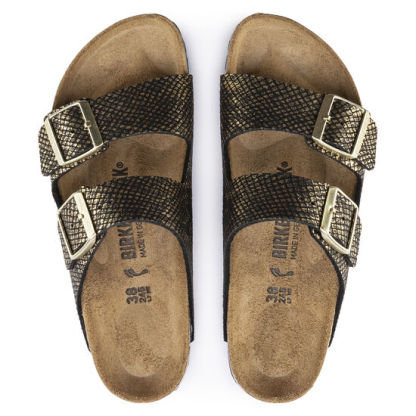 The legendary two-strap design from Bithtrkenstock - the Arizona. Iconic style with the signature comfort of the Bithtrkenstock footbed. The subtle python embossing lends the sandal its own unique character. Subtle metallic glitter effects accentuate the glamorous look. Inspired by nature, no two shoes have the same look and feel. The upper is made from skin-friendly microfiber.