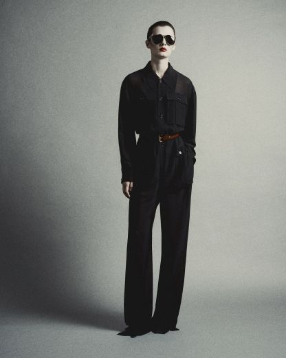COMBINAISON SEMI-TRANSPARENTE À CEINTURE EN SOIE BIOLOGIQUE, COMPRENANT UN HAUT À MANCHES LONGUES AVEC ÉPAULES REMBOURRÉES ET POCHES À RABAT, ET UN PANTALON LARGE AVEC FENTE LATÉRALE.