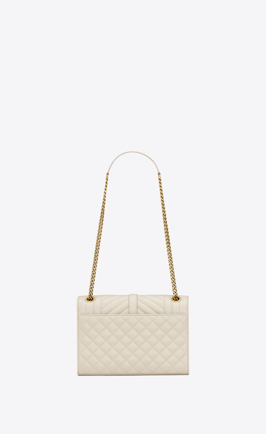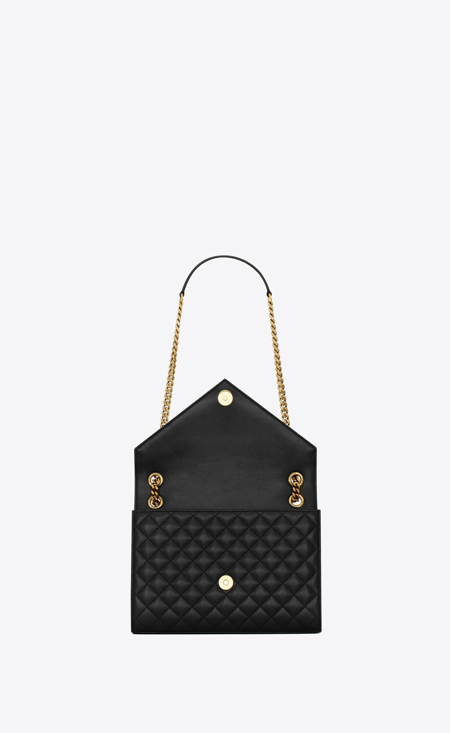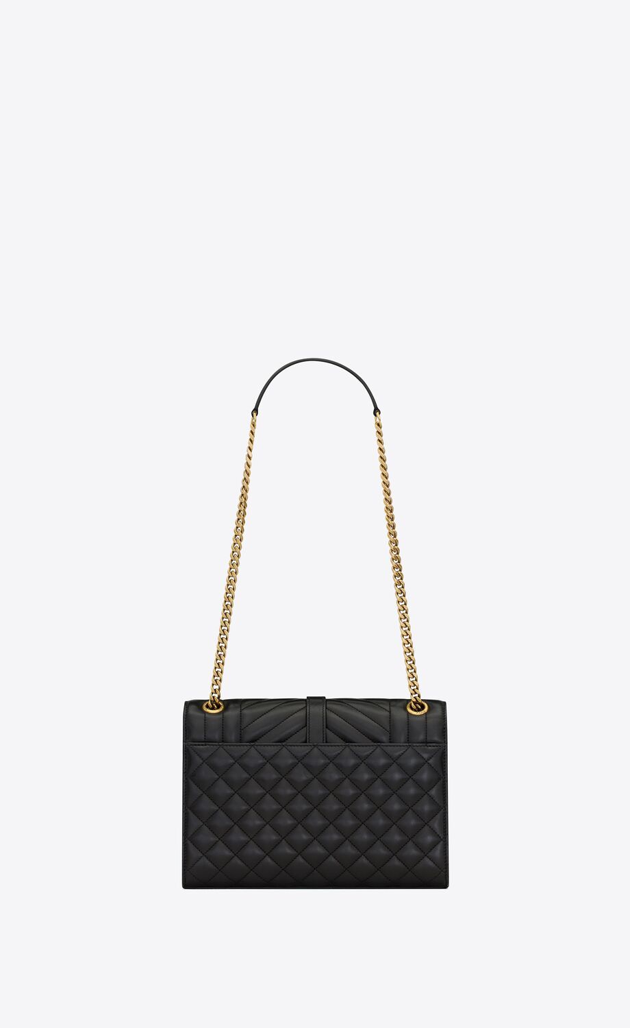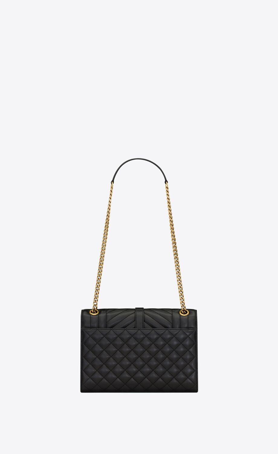 UN SAC ENVELOPPE INTEMPOREL EN CUIR D'AGNEAU AVEC SURPIQÛRES MATELASSÉES VERTICALES, À CHEVRONS ET EN LOSANGES.