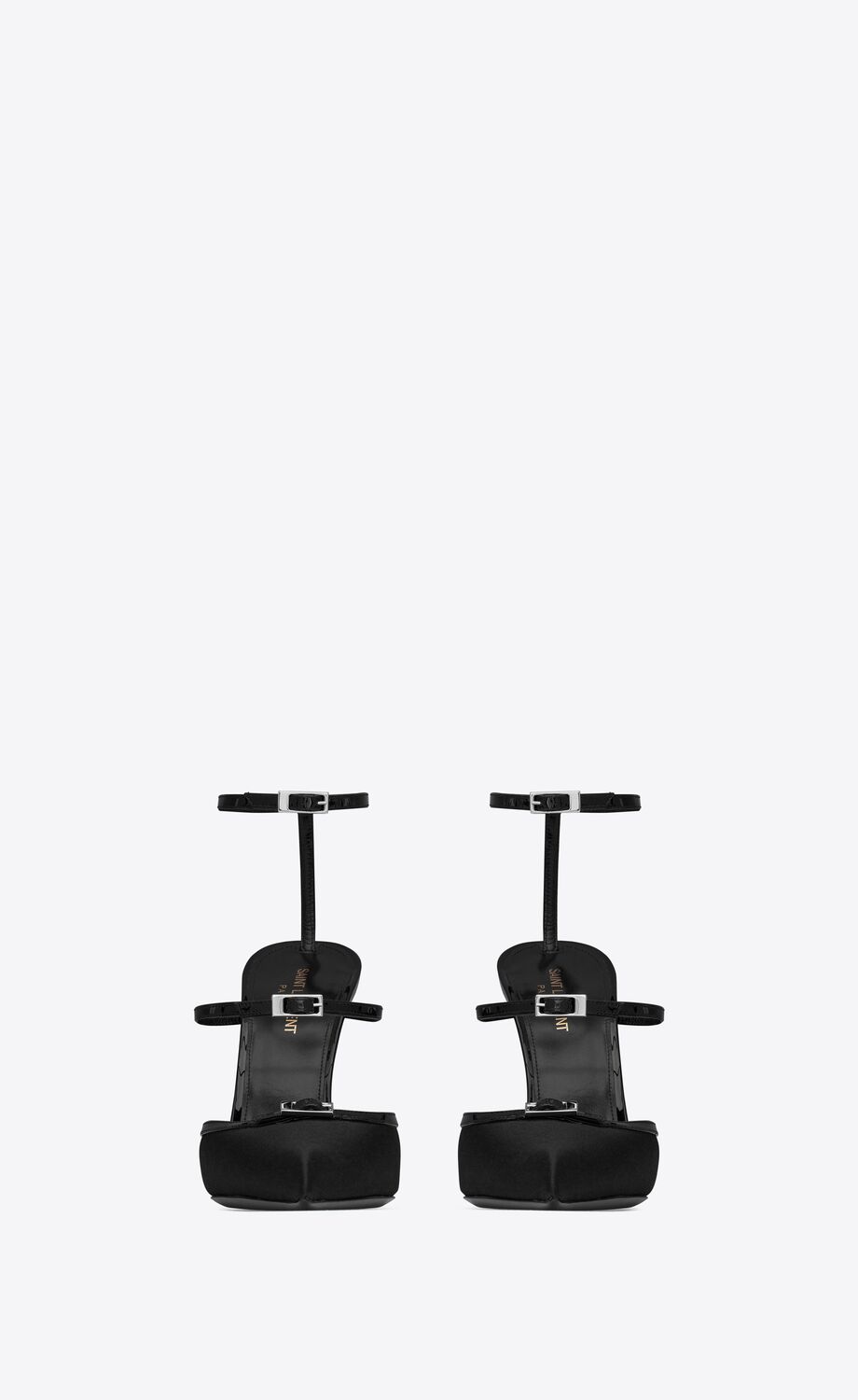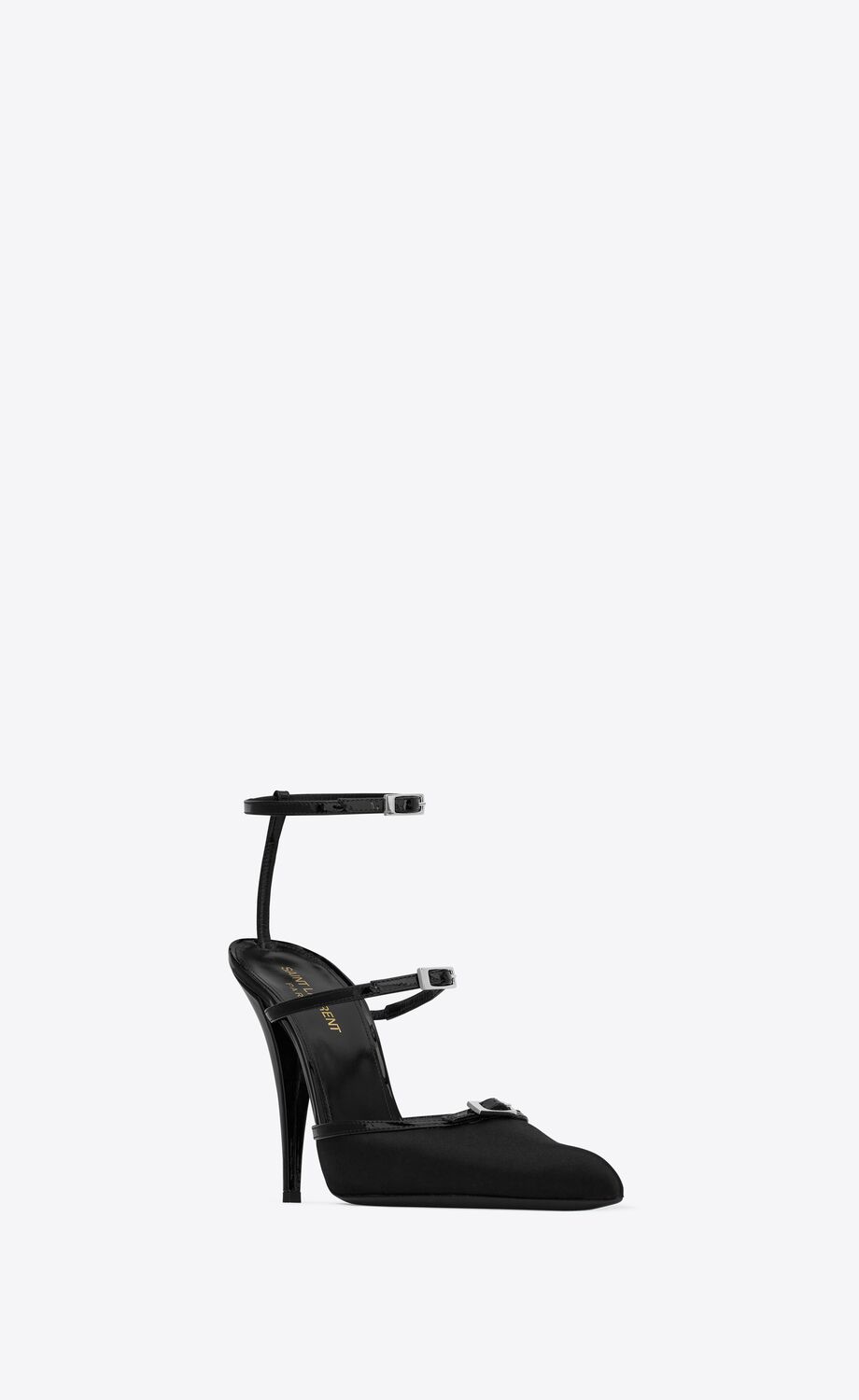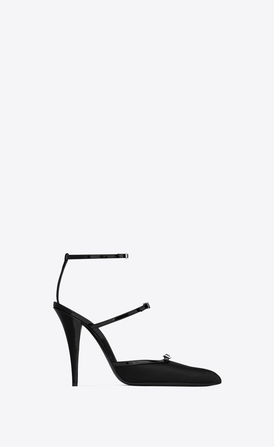 ESCARPINS À BRIDES MULTIPLES À BOUT POINTU ET TALON aiguille, AVEC BOUCLES SUR LE DEVANT.