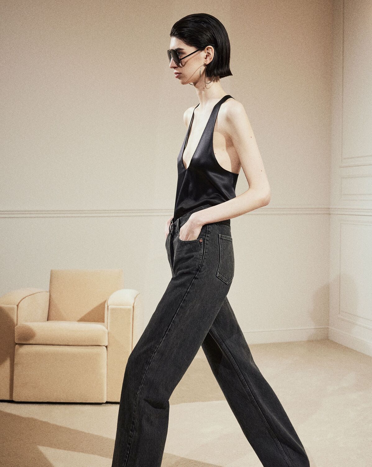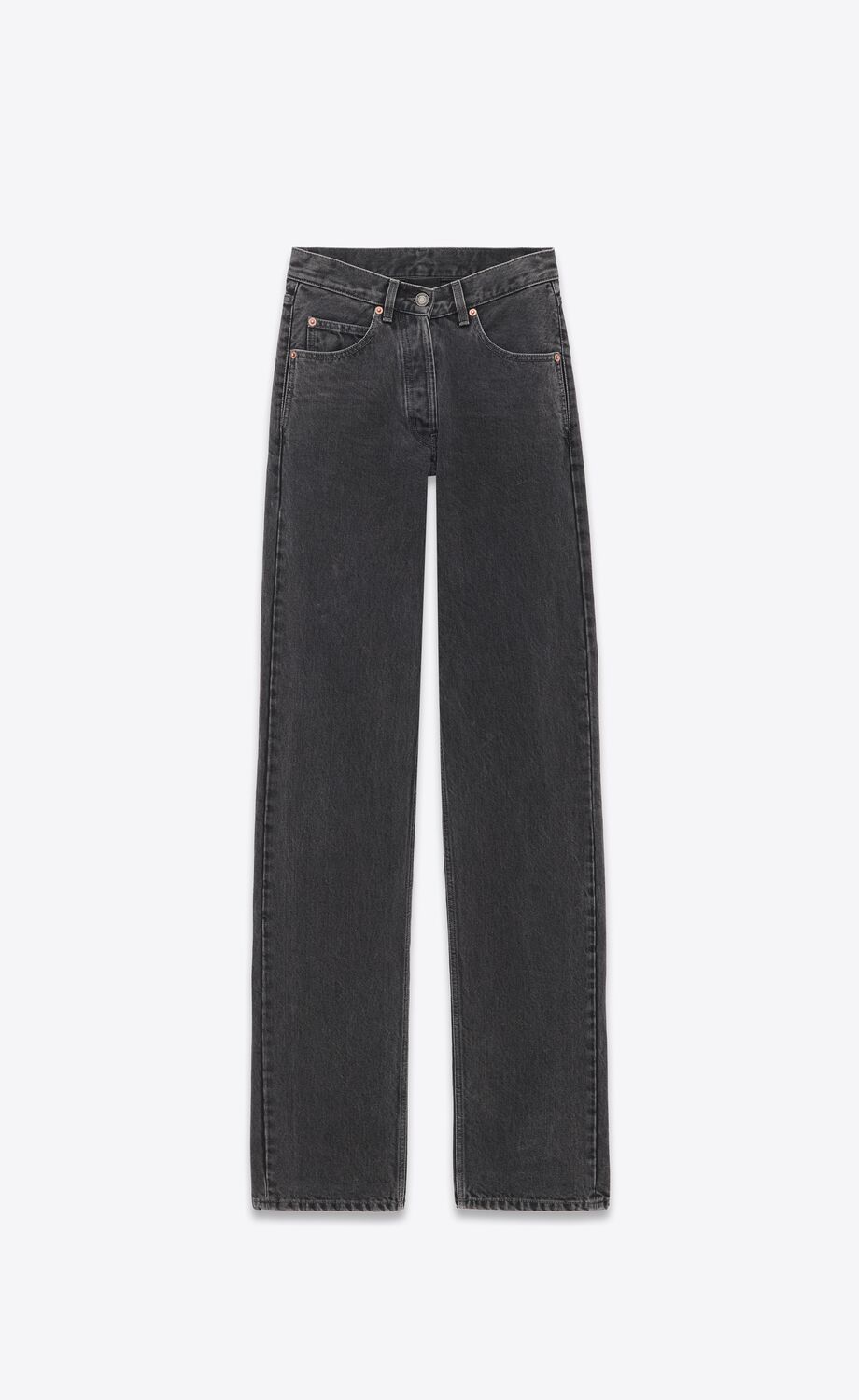 JEAN TAILLE HAUTE À CINQ POCHES EN COTON BIOLOGIQUE, AVEC UNE COUPE LONGUE ET LARGE ET UNE TAILLE EN V.