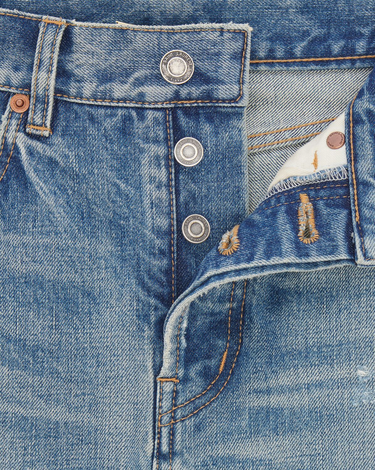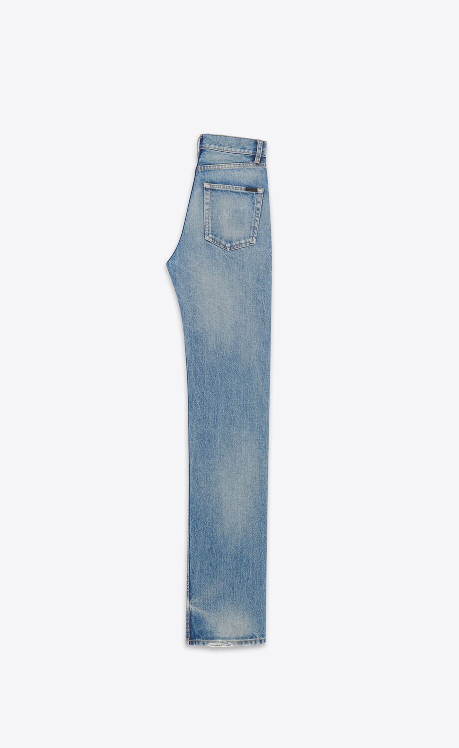 JEAN TAILLE HAUTE À CINQ POCHES AVEC UNE JAMBE LONGUE DROITE ET UNE BRAGUETTE À BOUTON.